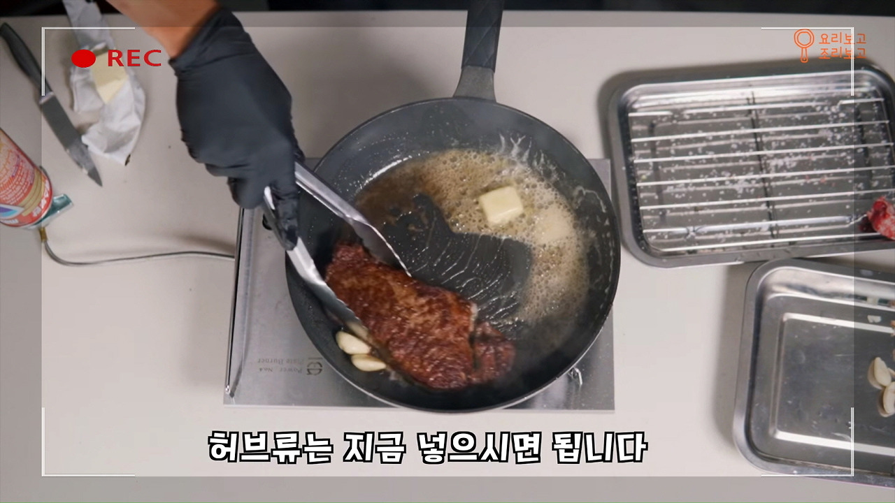 이때 로즈마리나 허브 같은 허브류를 넣으면 스테이크에 깊은 향을 더할 수 있습니다.