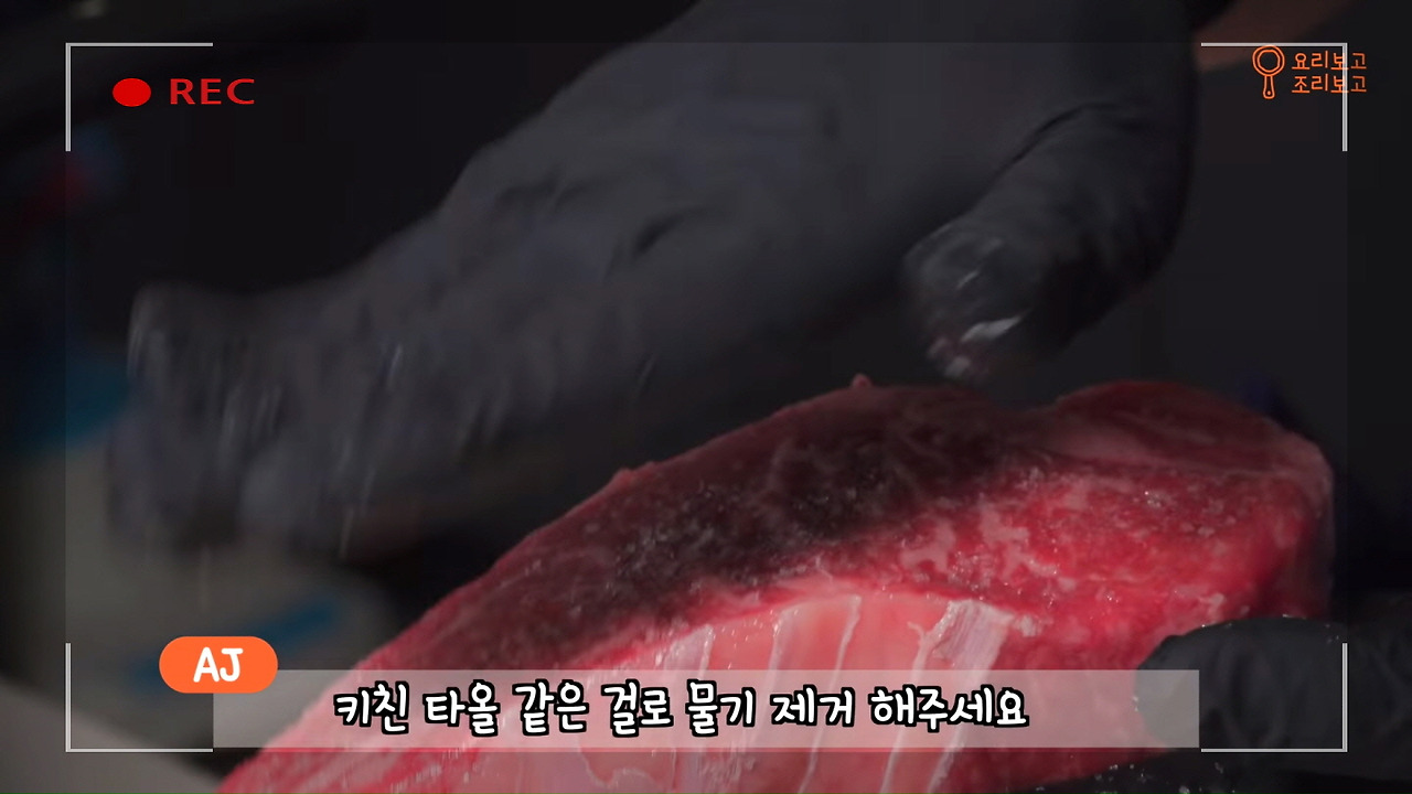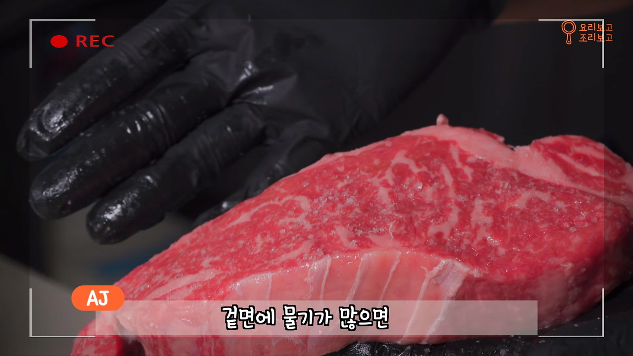 스테이크 맛있게 굽는 팁 1: 소금 간을 한 후, 스테이크용 고기의 겉면에 물기가 많으면 풍미가 제대로 배지 않아요. 따라서 키친타월로 물기를 잘 닦아내는 것이 중요합니다.