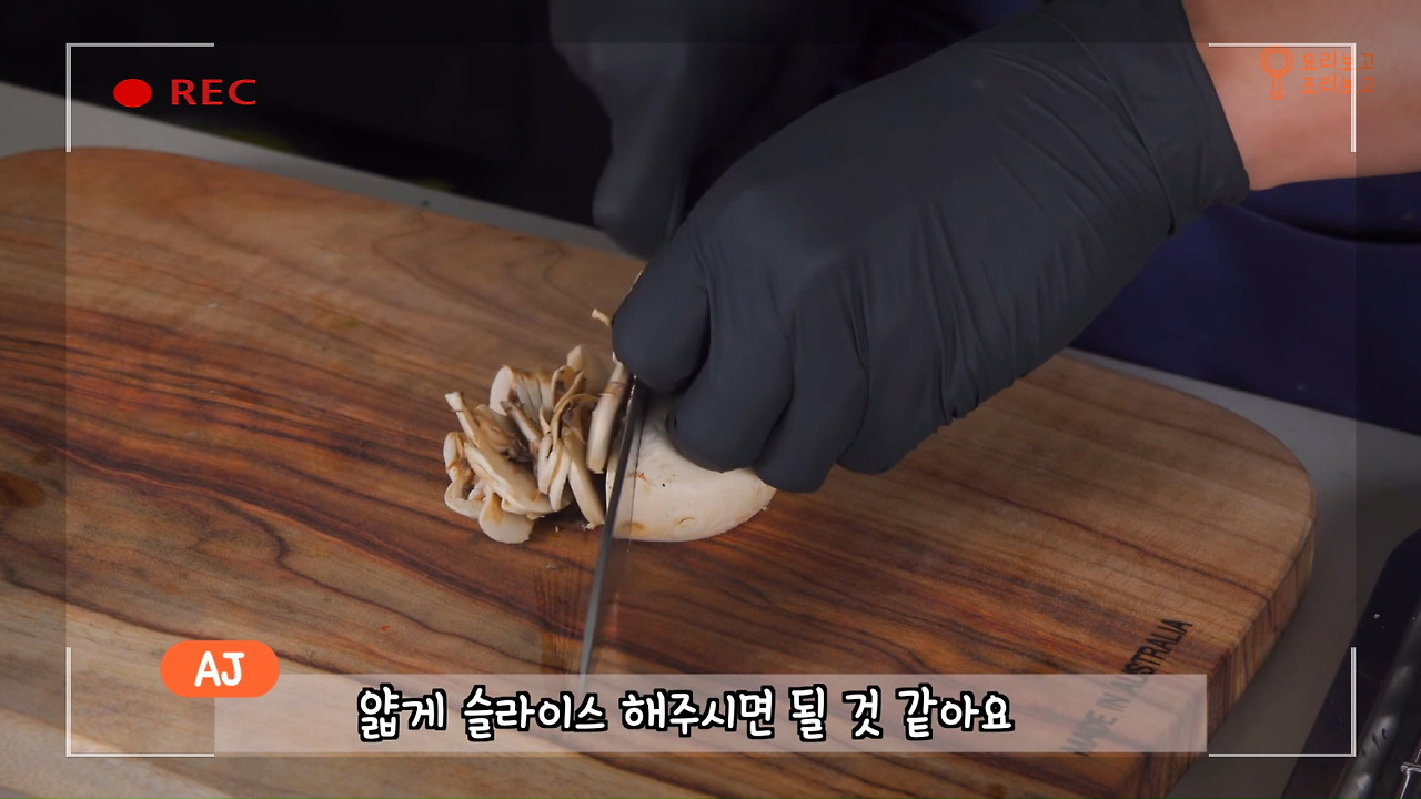 스테이크를 맛있게 굽기 위한 재료 손질 단계입니다. 양송이 버섯은 2개 준비한 후, 얇게 썰어주세요. 양송이버섯의 독특한 식감과 풍미가 스테이크의 맛을 더욱 돋보이게 해줍니다.