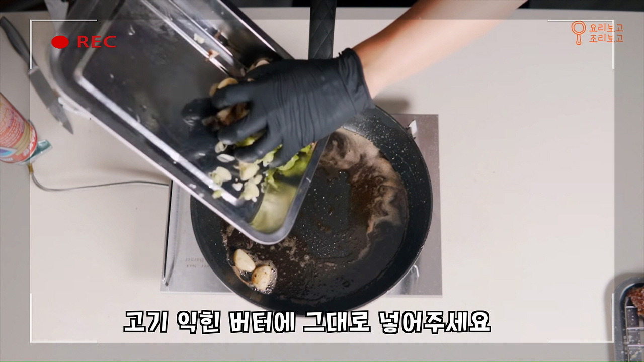 소의 기름과 버터, 마늘의 풍미가 가득한 팬에 손질한 재료들을 모두 넣어주세요.