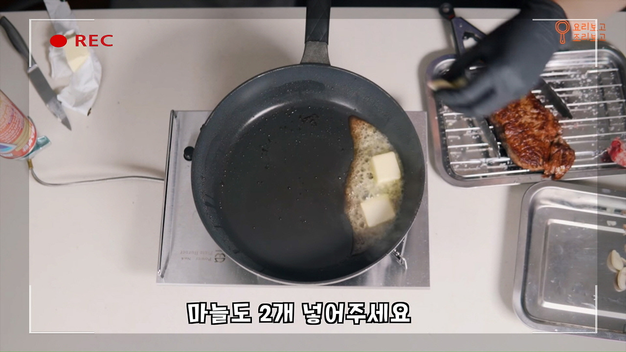 팬이 식기 전에, 뜨겁게 달군 팬에 버터 2조각과 마늘 2쪽을 넣고, 고기를 버터에 은은하게 익히면서 향을 배도록 해주세요.