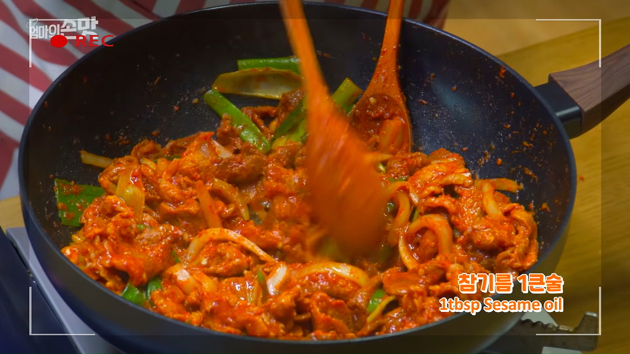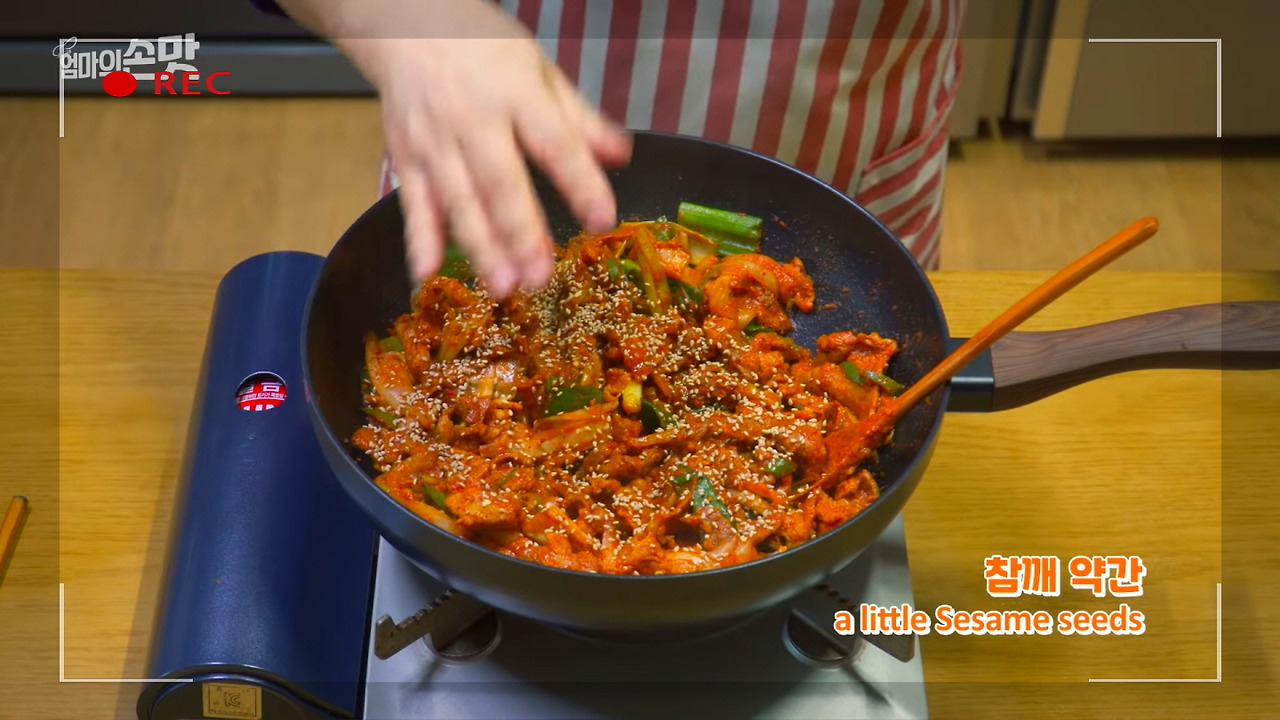 마지막으로 완성된 제육볶음 위에 참깨를 뿌려주면, 오늘의 제육볶음 만들기가 모두 끝납니다.