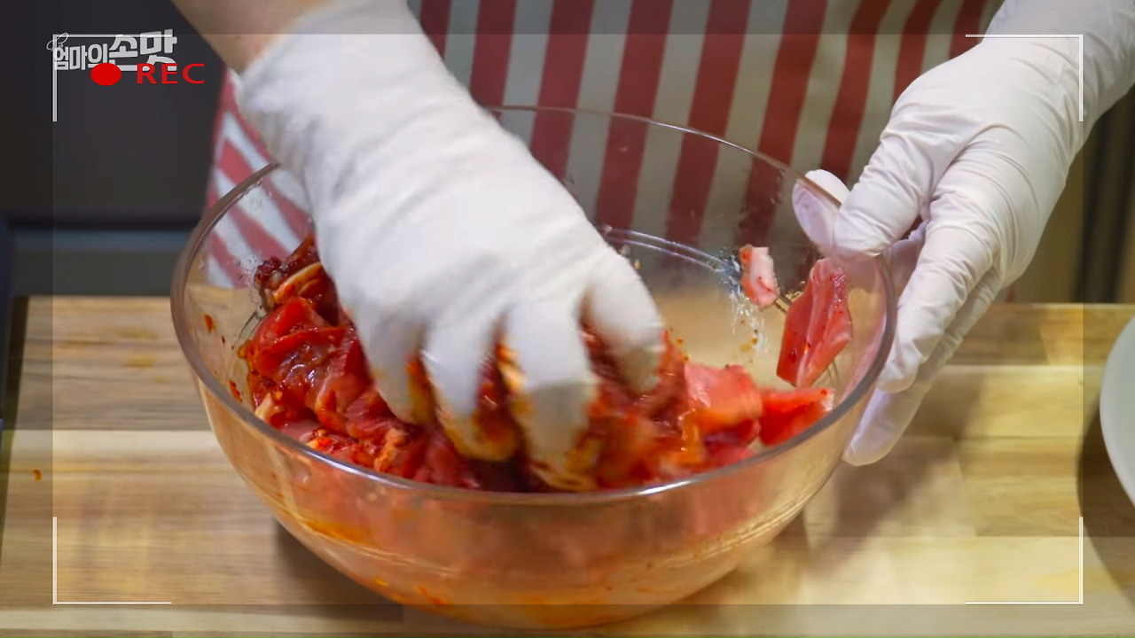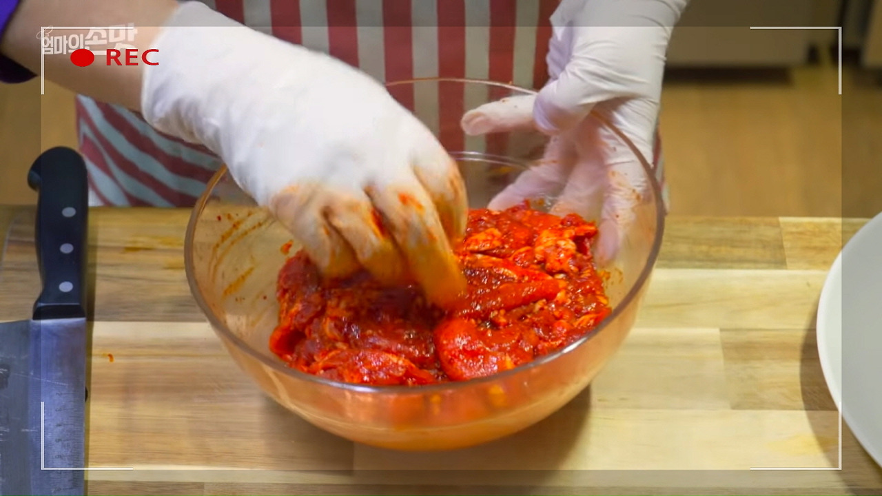 이제 제육볶음 양념장을 넣고 잘 섞어 준 뒤, 양념이 고루 배도록 잠시 재워두세요.