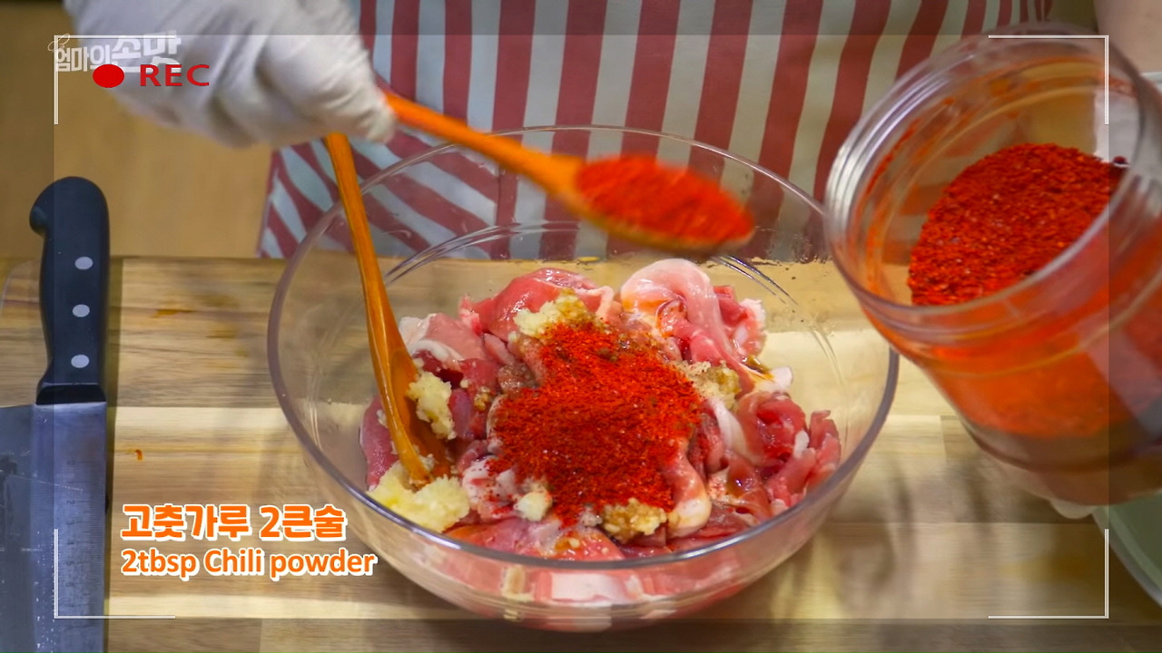 고추가루 2큰술을 넣어주면 제육볶음에 깔끔하면서도 칼칼한 맛이 더해져요.