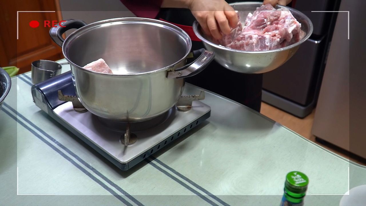 이제 돼지 등뼈를 부드럽게 익히는 과정입니다. 데친 등뼈가 충분히 잠길 만큼 물을 넉넉하게 부어주세요.