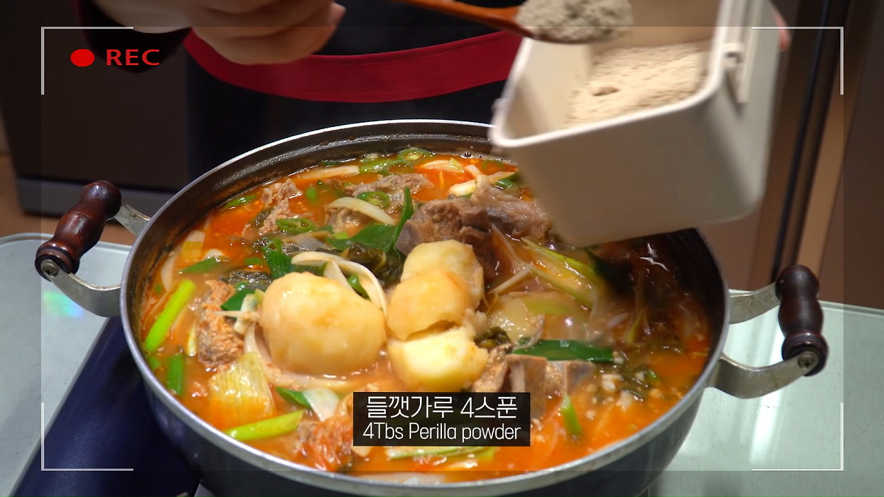 들깨가루 4스푼을 넣어주세요. 이렇게 충분히 넣어주면 감자탕이 고소하고 맛있을 뿐만 아니라 몸에도 좋답니다. 이제 오늘의 감자탕 레시피가 모두 완성되었습니다.