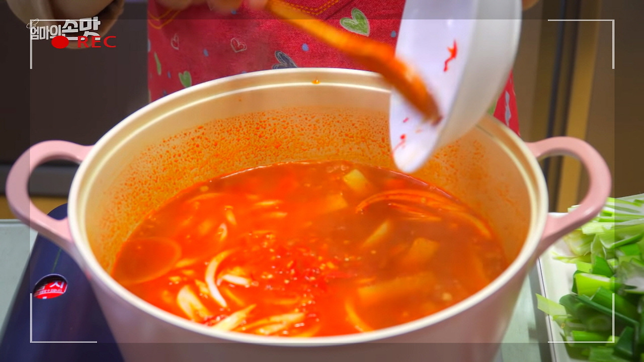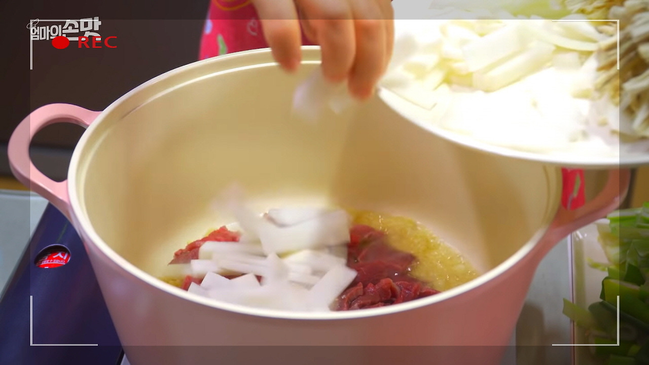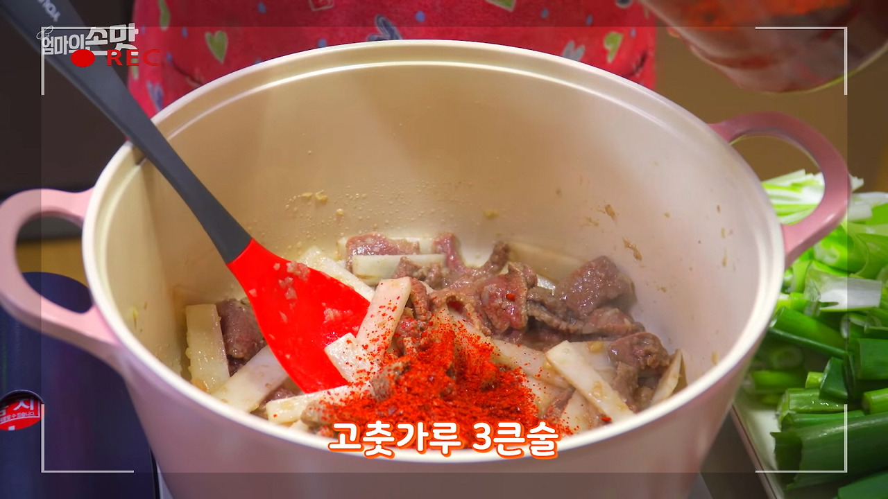 썰어둔 무를 넣고 함께 볶다가, 고기에 어느 정도 색이 나면 고춧가루 3큰술을 넣어주세요. 고춧가루가 기름에서 볶아지면 붉은 고추기름이 생기는데, 이 기름이 육개장의 맛을 한층 더 깊고 진하게 만들어줍니다.