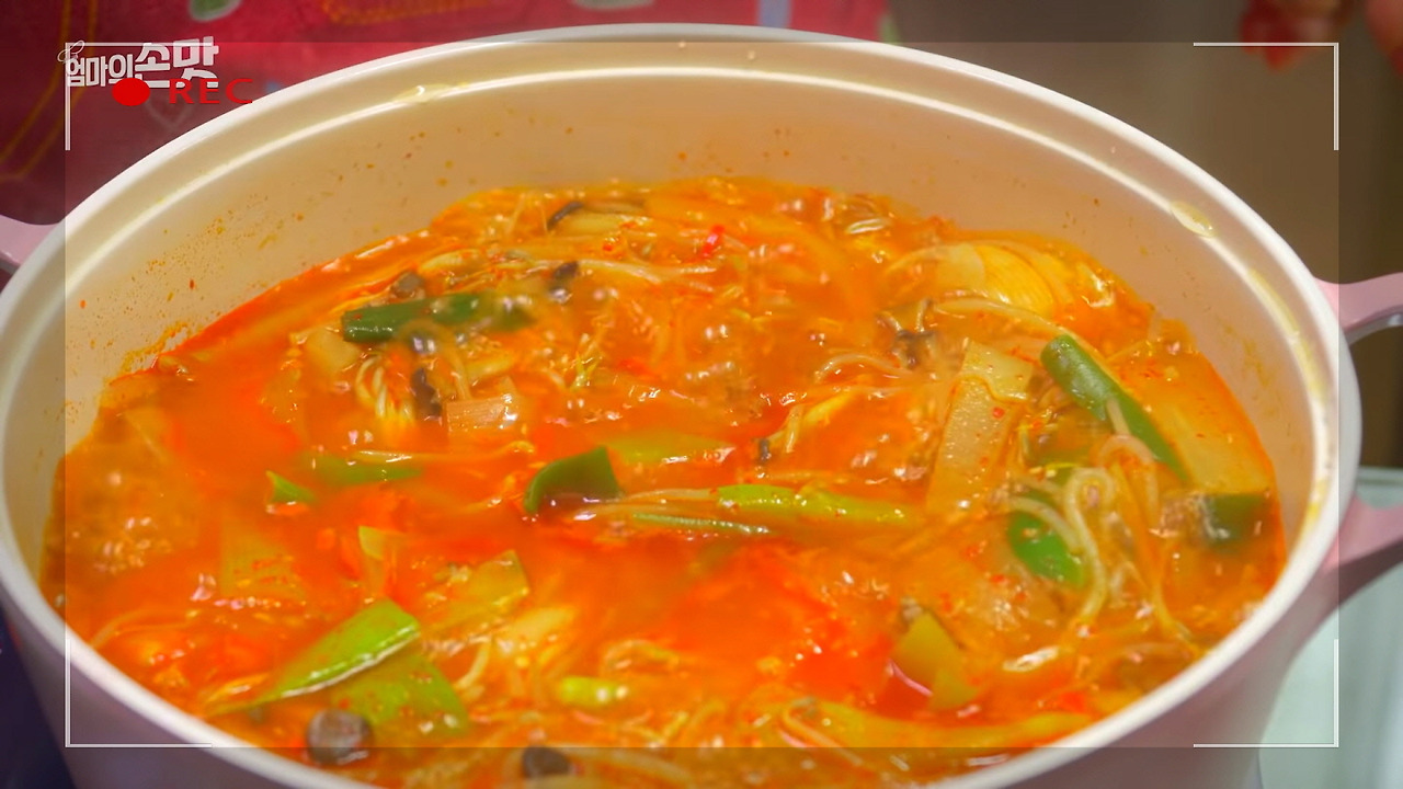 이제 팽이버섯을 넣고 잠깐만 더 끓여주면, 오늘의 육개장을 맛있게 끓이는 모든 과정이 마무리됩니다.
