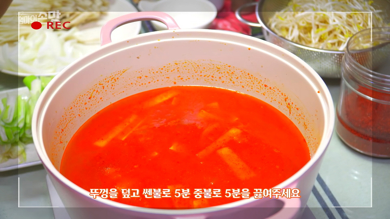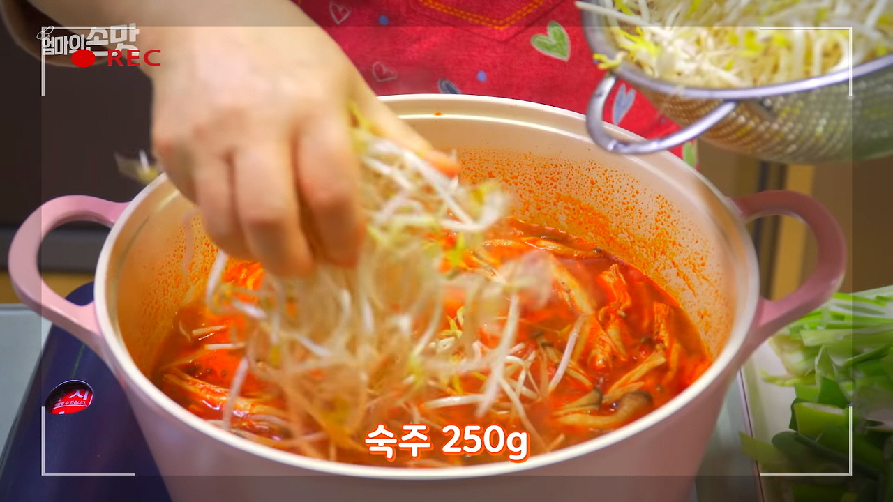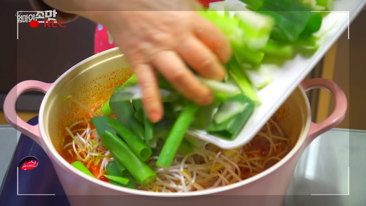 숙주와 대파를 포함한 나머지 재료들(팽이버섯 제외)도 함께 넣고, 뚜껑을 덮은 뒤 잠시 끓여주면 야채들이 살짝 익으면서 숨이 죽습니다.