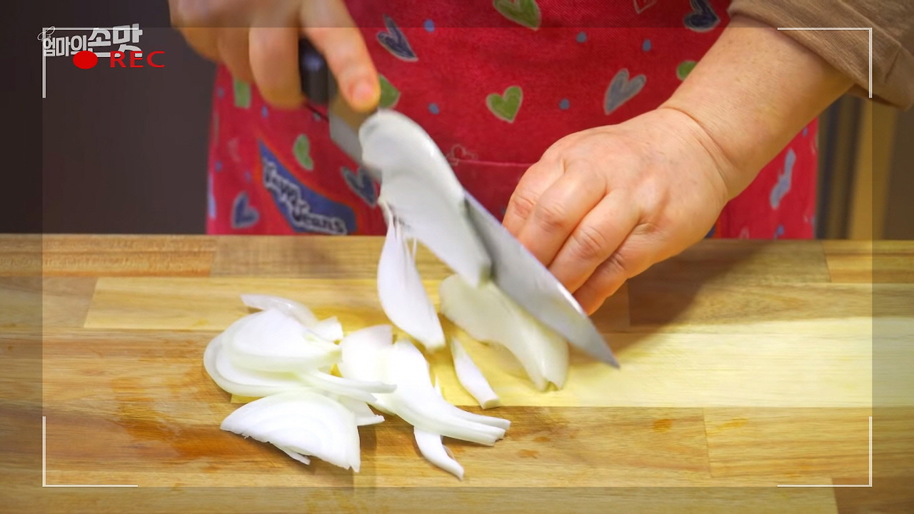 양파는 먹기 좋은 크기로 얇게 슬라이스하여 잘라주세요. 양파는 육개장에 은은한 단맛과 함께 식감을 더해줘서 맛을 한층 부드럽게 만들어줍니다.