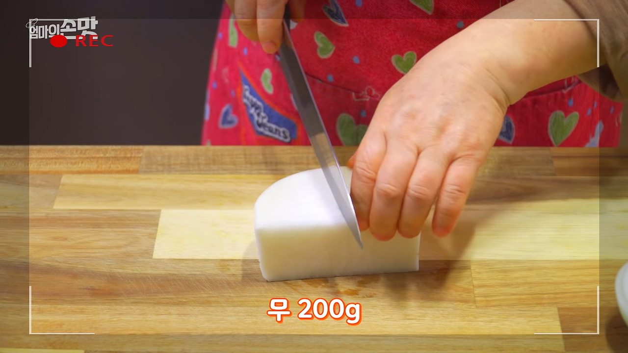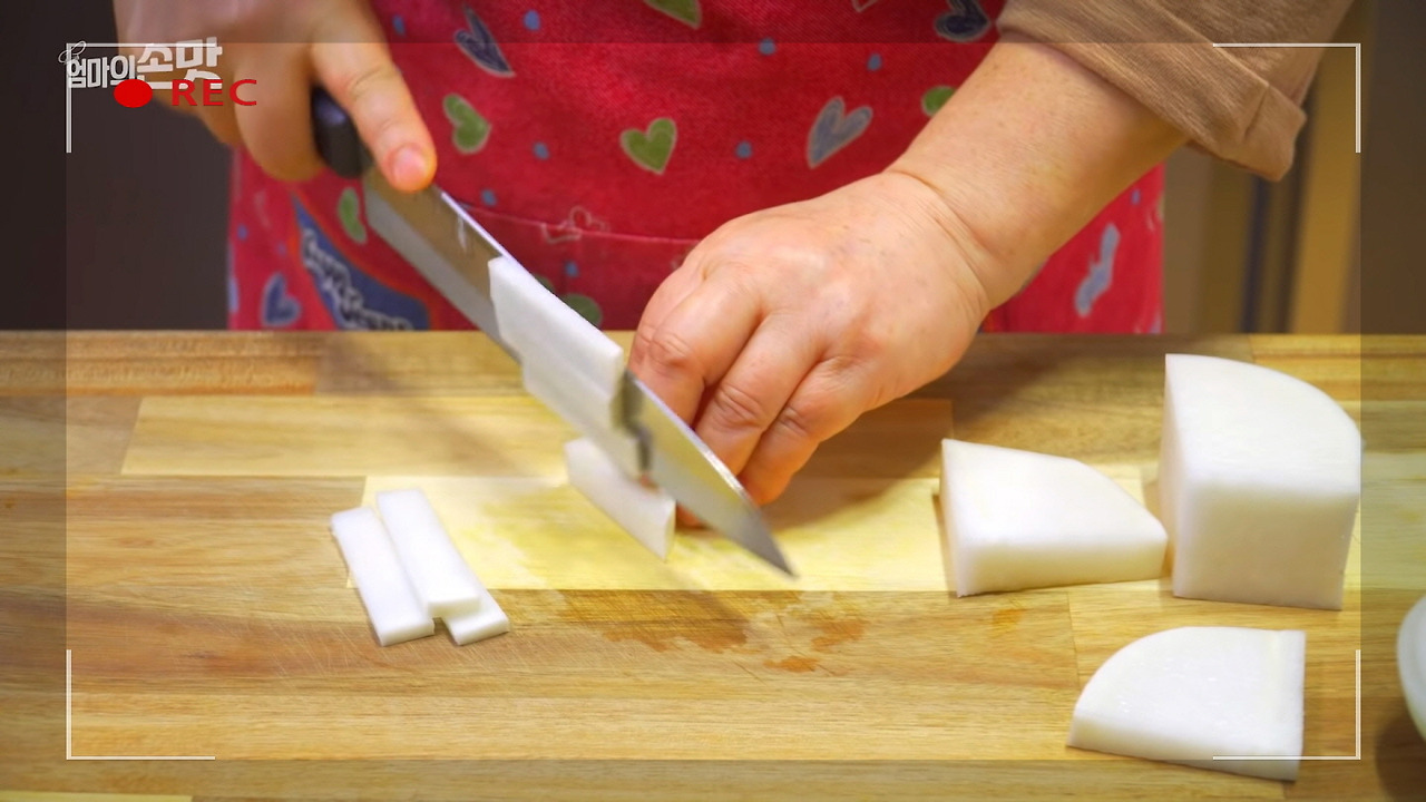 이제 육개장에 들어갈 재료를 준비할 시간입니다. 무 200g은 적당한 크기로, 먹기 좋은 모양으로 썰어주세요. 무의 시원하고 깔끔한 맛과 부드러운 식감이 육개장의 맛을 더욱 풍부하게 만들어줍니다.