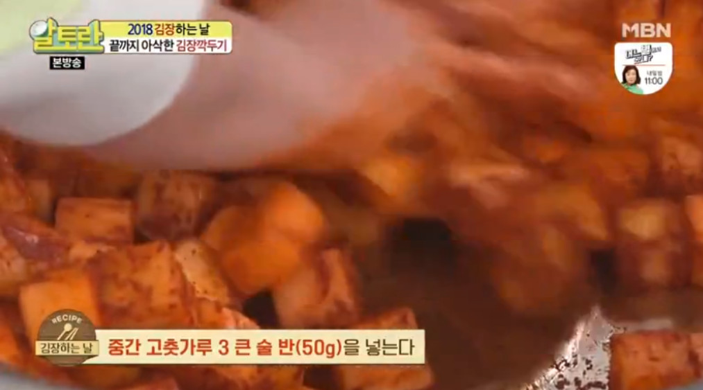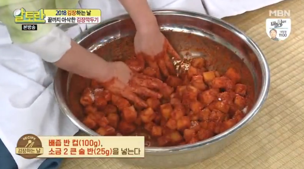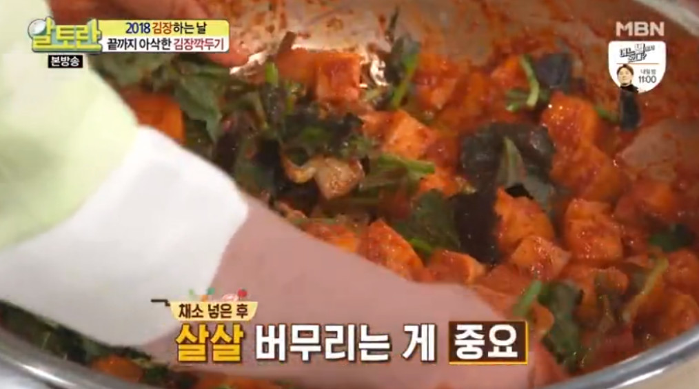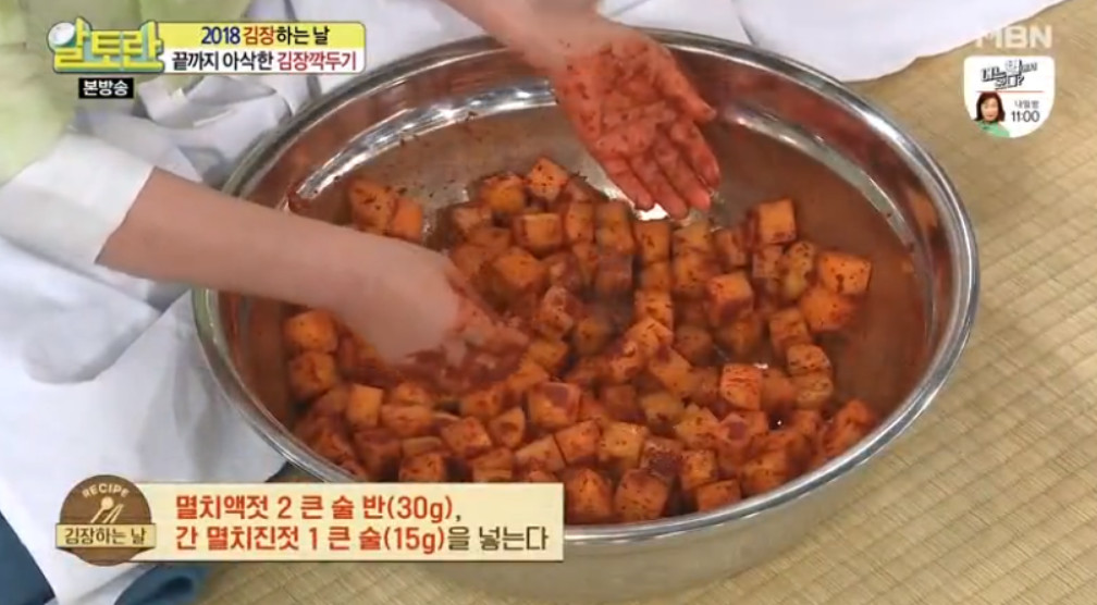세게 버무리지 말고 부드럽게 살살 버무려주세요. 이게 아주 중요해요. 이렇게 하면 맛있는 김장 깍두기가 완성됩니다.