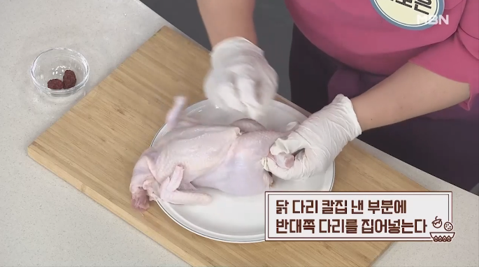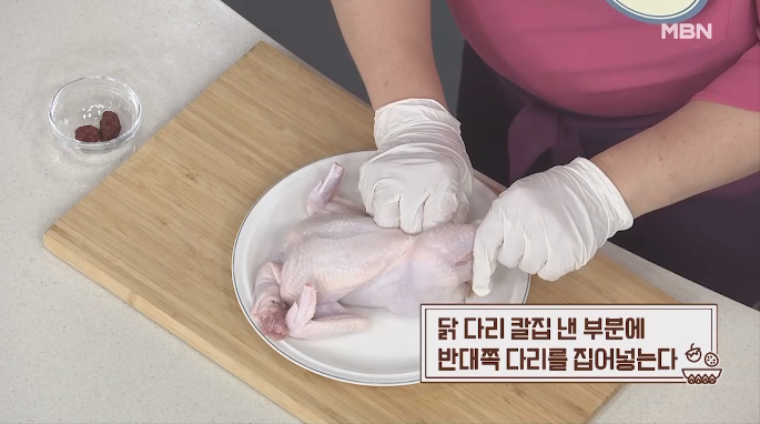 9. 닭 다리에 칼집을 낸 다음, 반대쪽 다리를 그 칼집에 끼워 넣어 주세요.