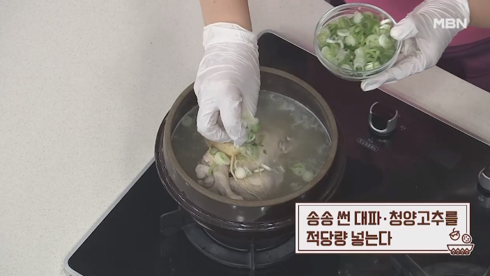 17. 마지막으로 송송 썬 대파와 청양고추를 적당히 넣어주면, 이보은 요리연구가의 삼계탕 황금레시피가 완성됩니다.