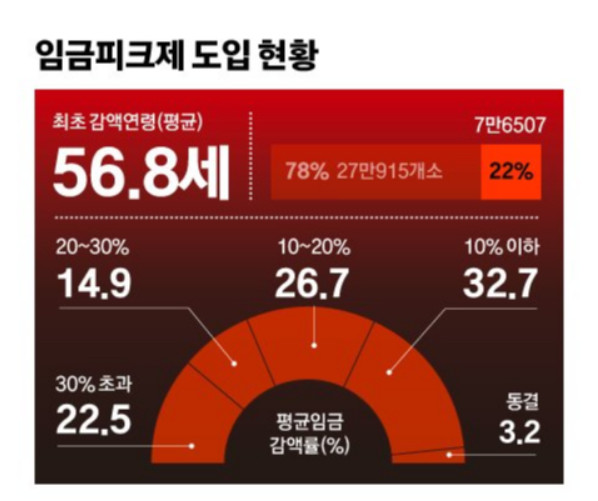 이 제도는 정년이 늘어남에 따라 생기는 고용 유지 부담을 덜어주는 동시에, 청년층의 신규 채용 확대라는 긍정적인 기대감도 담고 있었습니다. 실제로 대기업의 약 절반가량(300인 이상 기업의 48.7%)이 임금피크제를 도입한 것으로 나타났으며, 중소기업(300인 미만)에서도 약 4.58%가 해당 제도를 운영하고 있습니다.