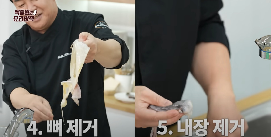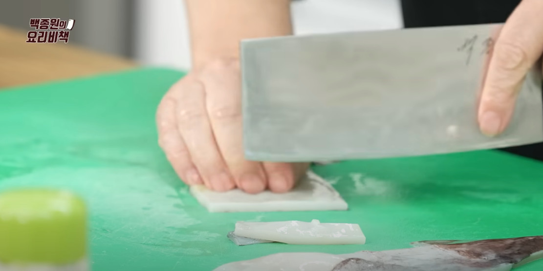 1. 먼저 오징어를 손질해주셔야 합니다. 손톱으로 오징어 다리에 붙어있는 빨판을 벗겨주고 몸통은 가위를 이용하여 배를 갈라주세요. 이후 몸통과 다리를 분리해주고 뼈와 내장 그리고 오징어 눈을 제거해주시면 됩니다. 간혹 오징어 무국을 끓일 때 오징어 껍질을 벗기시는 분들이 계신데, 백종원 선생님은 껍질을 그냥 둔다고 하네요. 이유는 오징어 껍질이 있어야 국물이 더 맛있어지기 때문이래요.
