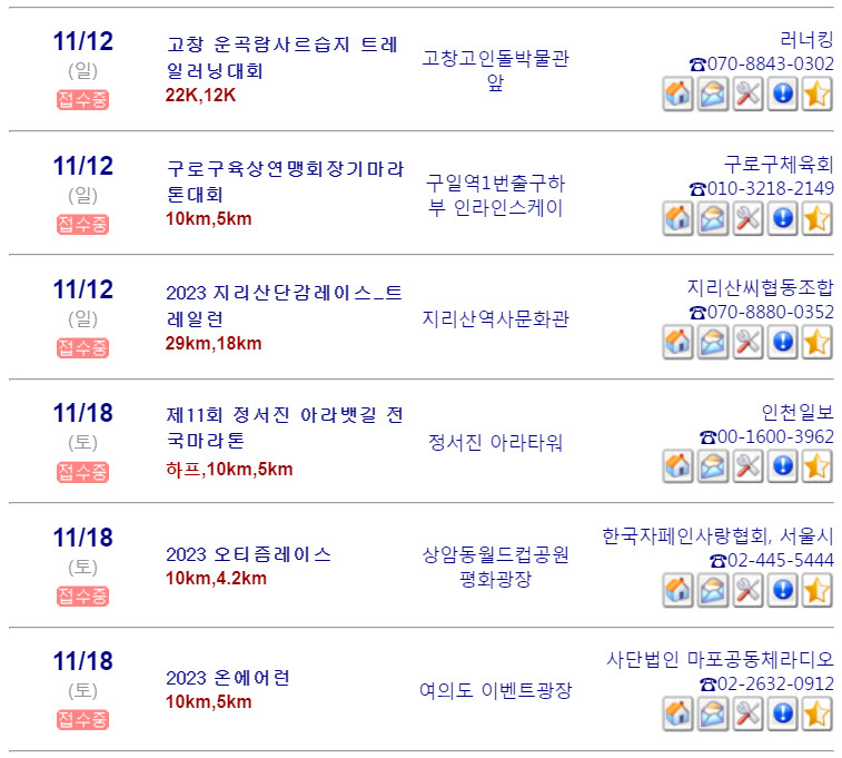 현재시점(2023년 10월 27일) 기준으로 "접수 중"인 마라톤 대회의 일정은 아래와 같으며 좀 더 자세하게 2023년 하반기 마라톤 일정에 관심이 있는 분들은 아래 링크를 통해 직접 확인하실 수 있습니다.