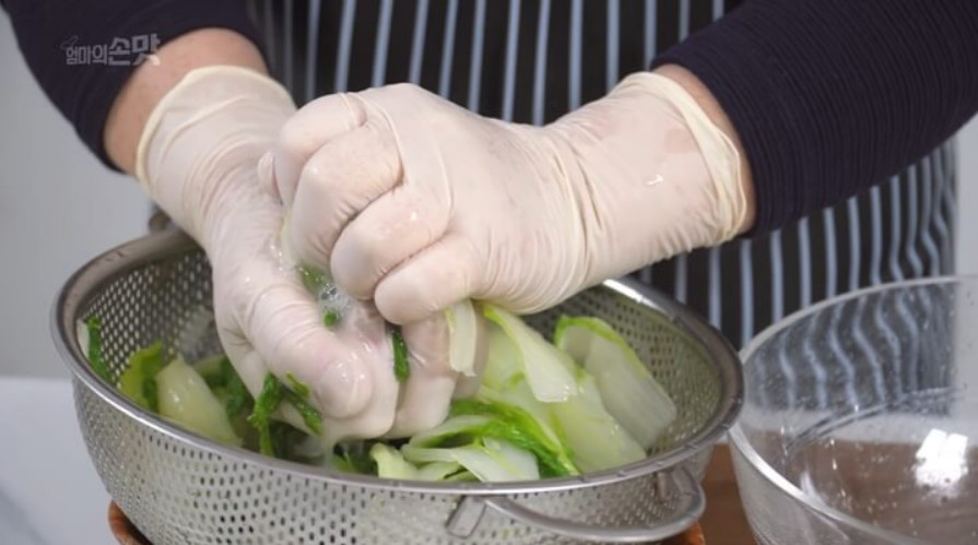 데친 봄동은 찬물에 헹궈 건져내고, 넓은 줄기 부분은 손으로 적당한 크기로 찢어준 뒤, 물기를 꼭 짜서 그릇에 담아줍니다.