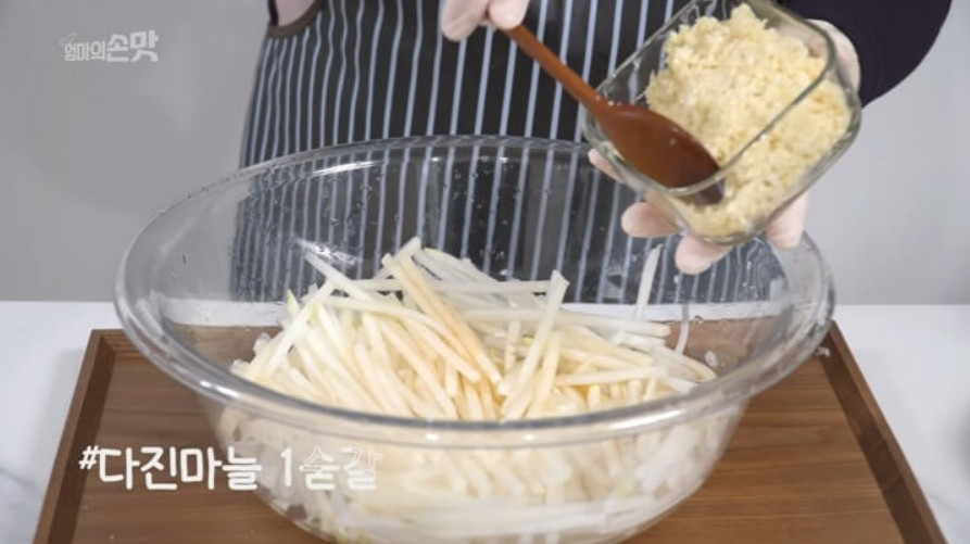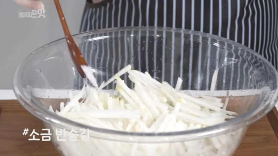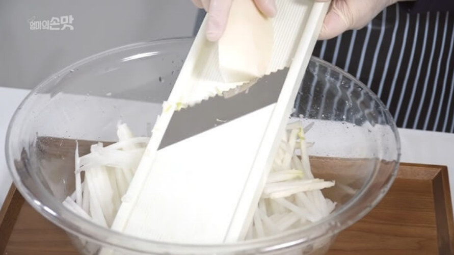 채칼을 사용해 무를 채 썰고, 소금 1/2스푼, 참치액 1스푼, 다진 마늘 1스푼을 넣어 잘 버무려주세요.