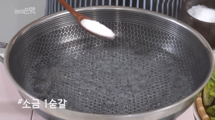 냄비에 물을 넣고 팔팔 끓인 후 소금 한 스푼을 더해 주세요. 소금을 넣으면 나물에 살짝 간이 배고, 색감도 더욱 선명해져요. 봄동은 줄기 부분부터 물에 넣어 데치기 시작해, 차례로 잎 부분도 잠기도록 해가며 데쳐줍니다.