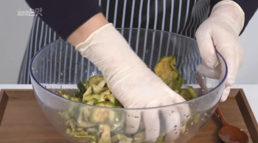 봄동 나물은 그냥 무치기만 하면 되지만, 나머지 4가지 나물인 호박, 고구마줄기, 건취나물, 무나물은 볶아줘야 해요. 먼저 양념을 해두고, 무나물을 먼저 볶은 다음 나머지 나물들을 하나씩 차례로 볶아주면 편리해요.