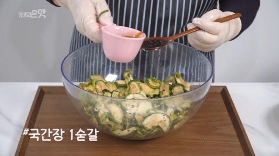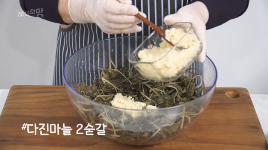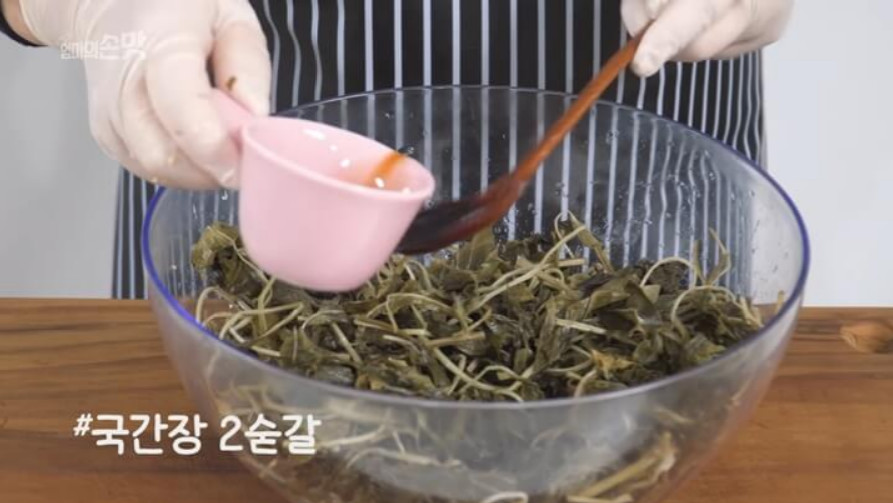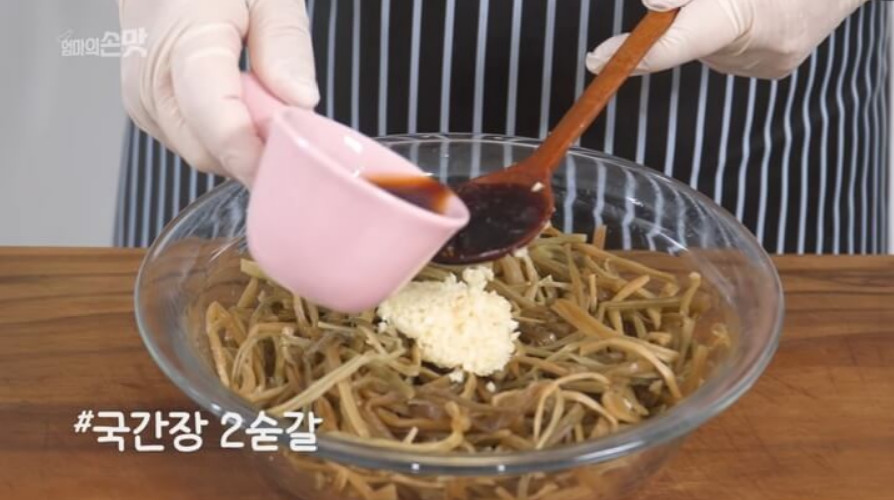 그 다음, 국간장 2스푼, 참치액 2스푼, 다진 마늘 2스푼을 넣고 잘 버무려줍니다. 간이 싱거운 경우에는 국간장을 추가해 간을 맞추면 좋아요. 건취나물은 국간장으로 간을 해야 더욱 맛있답니다.