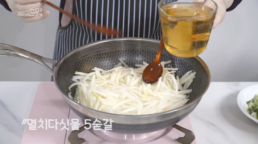 팬을 달군 후 무나물을 넣고 볶아줍니다. 무나물에는 식용유를 사용하지 않아야 깔끔한 맛이 납니다. 멸치 다시 물 5스푼을 추가하고 볶아주세요.