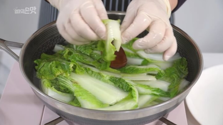 봄동을 데칠 때는 너무 물러지지 않도록 주의하며, 중간에 한 번 뒤집어주고 봄동이 약간 휘어질 정도로만 데쳐주세요. 이렇게 하면 무쳤을 때 아삭한 식감을 살릴 수 있어요.