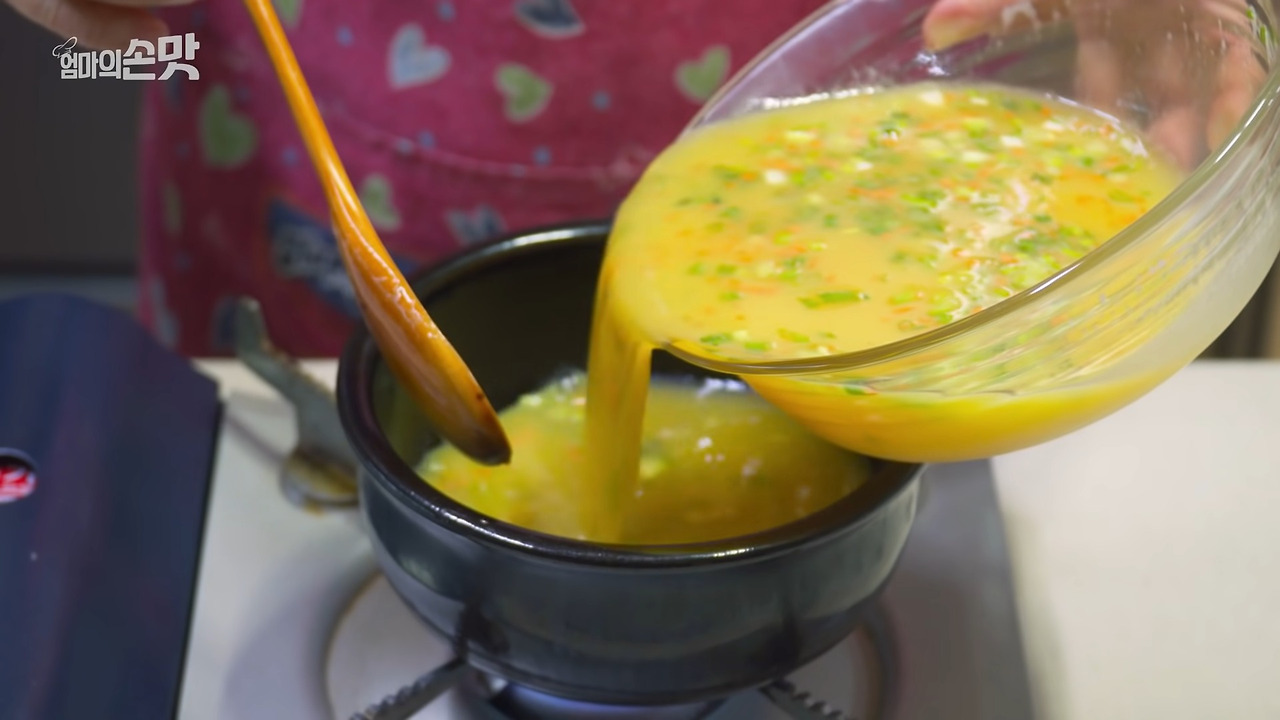 계란찜을 맛있게 만드는 다섯 번째 단계는 뚝배기에 계란을 모두 부어주는 거예요. 눌러붙지 않도록 조심스럽게 천천히 저어줍니다. 잠시 멈춘 후 다시 한 번 살살 저어주고, 뚜껑을 덮고 찌기 시작하세요.