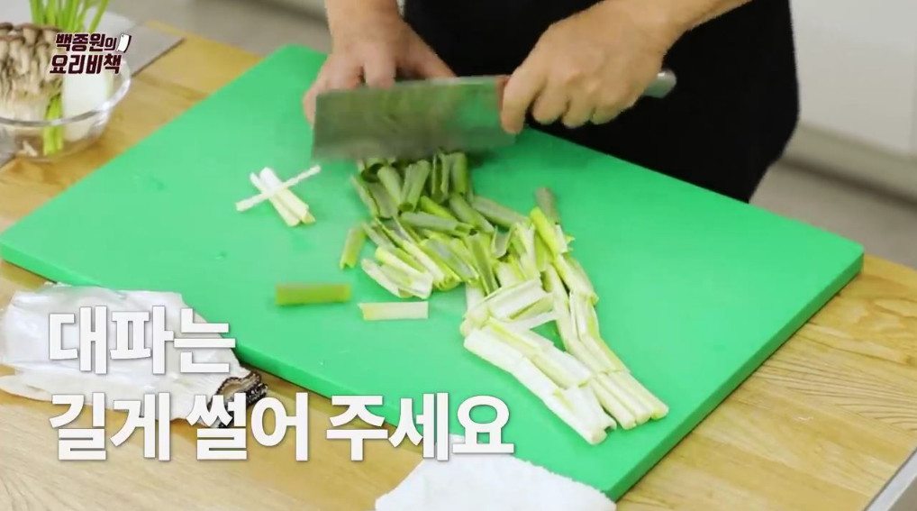 4. 이제 재료 손질을 시작할 차례입니다. 대파는 사진처럼 길게 반으로 자른 후, 5~6cm 길이로 길게 썰어 주세요.