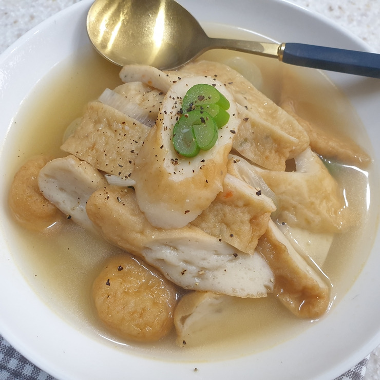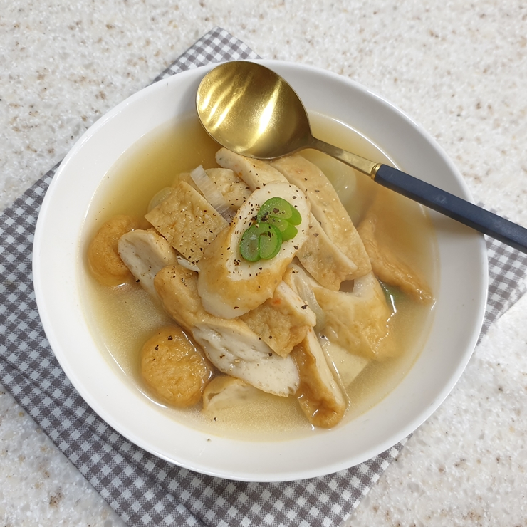그릇에 담아내면 완성입니다. 어묵 자체에 맛이 있어서 탕을 끓일 때 많은 재료나 양념이 필요하지 않아요. 요즘은 어묵을 살 때 국물 스프가 함께 들어 있는 제품도 있어서, 육수를 내기 어려울 때는 어묵 스프를 활용하기도 해요.