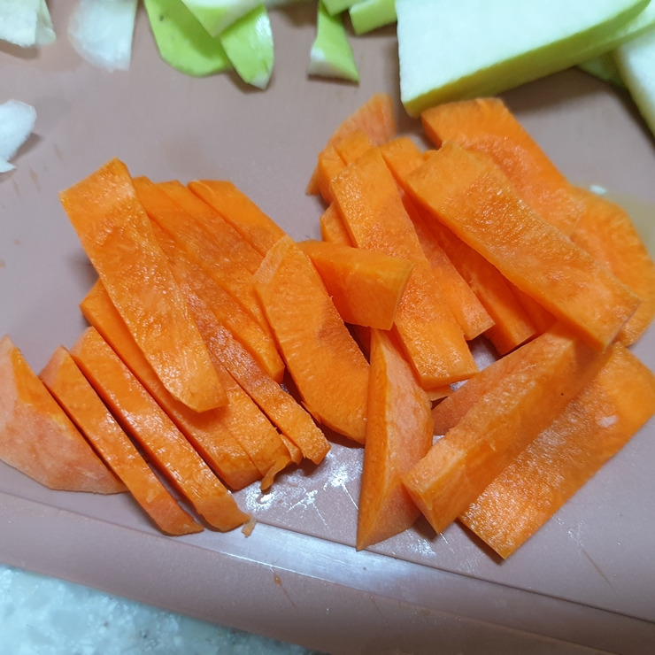 3. 무는 길쭉하거나 넙적하게 썰어 주세요. 당근도 무와 비슷한 크기로 썰어 주세요.