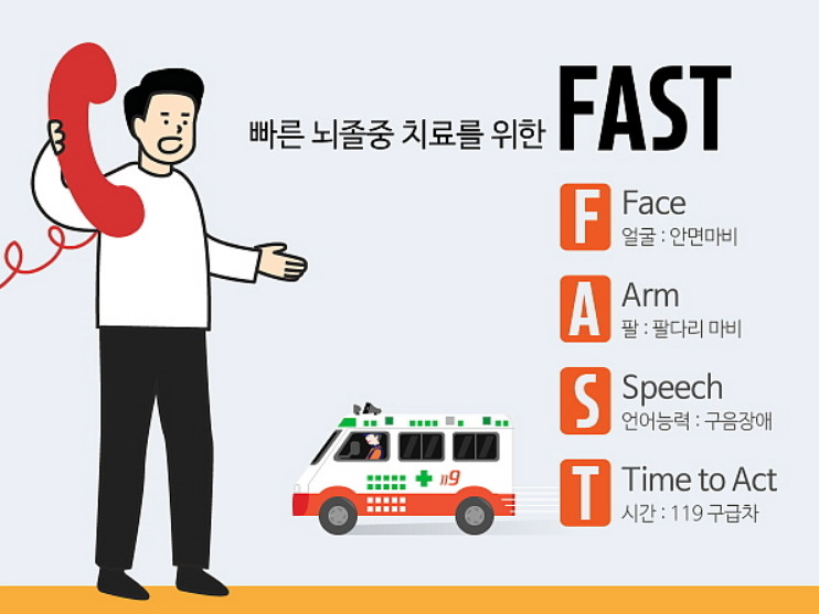 4. Time : 이러한 방법으로 스스로 확인해보고, 하나라도 이상이 느껴진다면 즉시 시간을 지체하지 말고, 가족에게 도움을 요청하거나 119에 연락해 병원으로 가야 합니다.