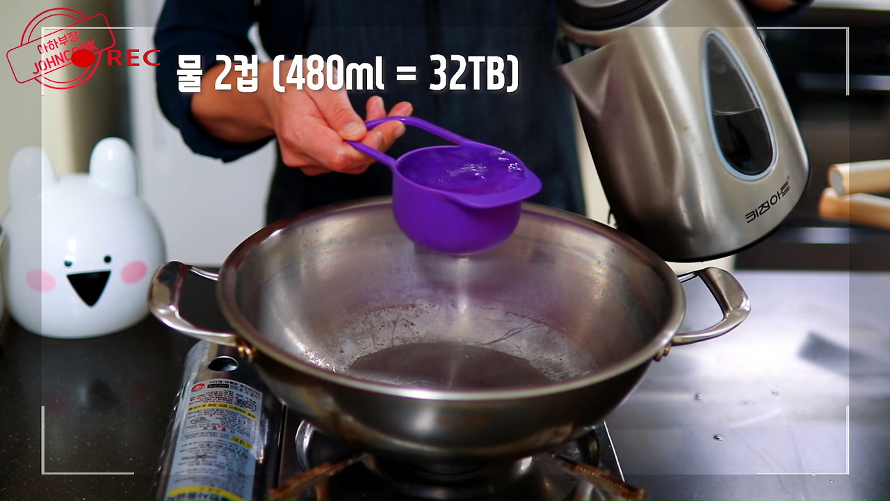 이제 닭을 데치는 과정입니다. 먼저 물 2컵을 넣고, 물이 끓어오를 때까지 기다린 뒤, 닭을 한 번에 넣어주세요.