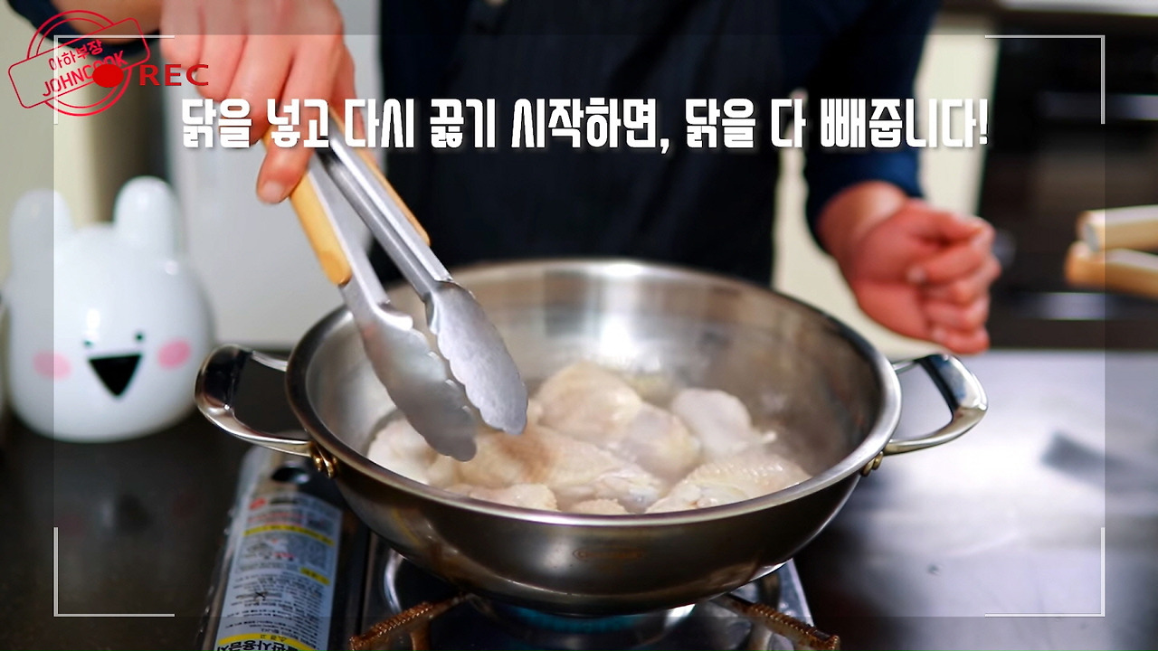 닭을 넣고 물이 다시 끓어오르면, 닭을 바로 빼주세요. 겉만 살짝 데친다는 느낌으로 해주시면, 닭의 잡내가 확실히 줄어든답니다.