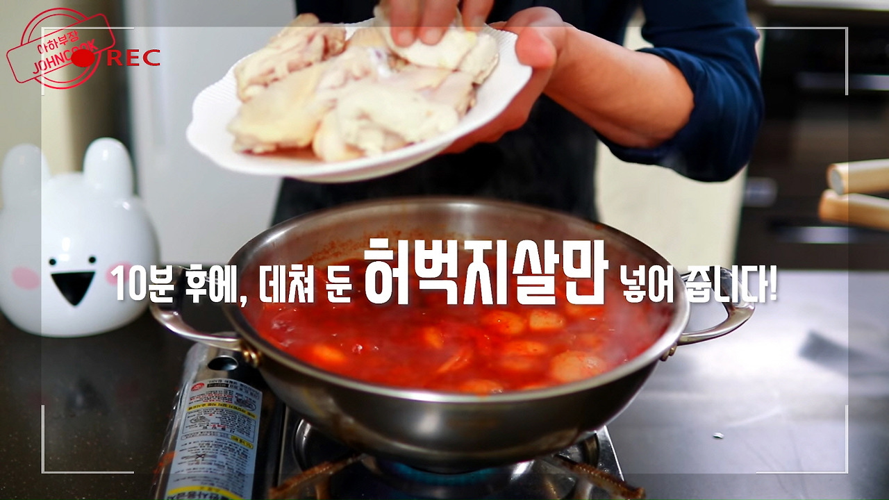 10분이 지난 후, 데쳐 둔 닭의 허벅지살만 넣어주세요. 시간이 지나면서 기름기가 빠져나오고, 그 깊은 맛이 닭볶음탕에 배어들어 더 맛있게 됩니다.