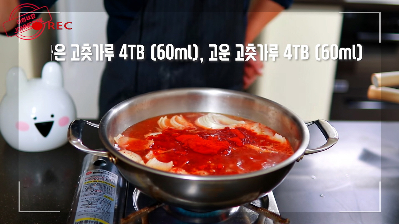 닭볶음탕의 양념장은 따로 만들지 않고 바로 넣어주시면 됩니다. 굵은 고춧가루와 고운 고춧가루를 각각 4티스푼씩 넣어주세요. 묵은지를 넣은 닭볶음탕을 원하시면, 고춧가루의 양을 절반으로 줄여서 조절하시면 됩니다.