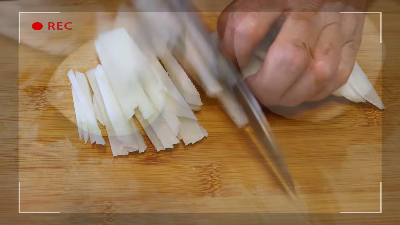 청양고추는 반으로 갈라 씨를 제거한 후, 얇게 채 썰어주세요.