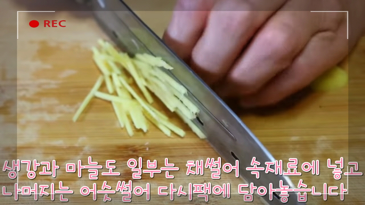 생강과 마늘은 일부는 채 썰어 속 재료에 넣고, 나머지는 편으로 썰어 다시팩에 담아주세요.