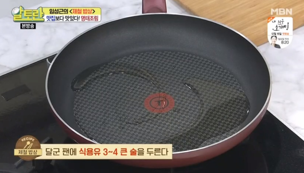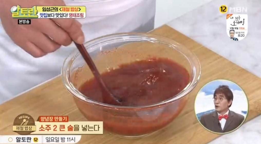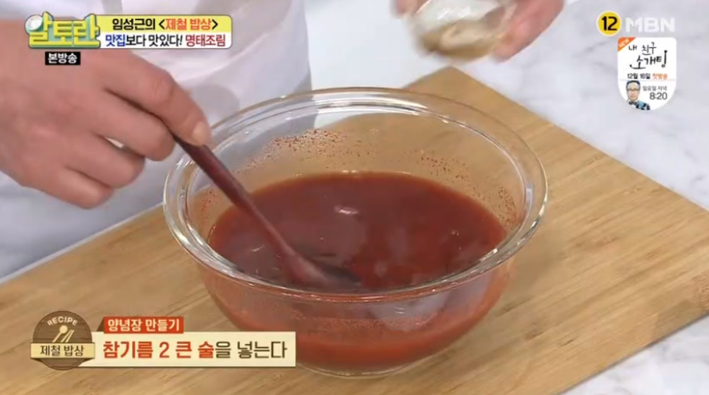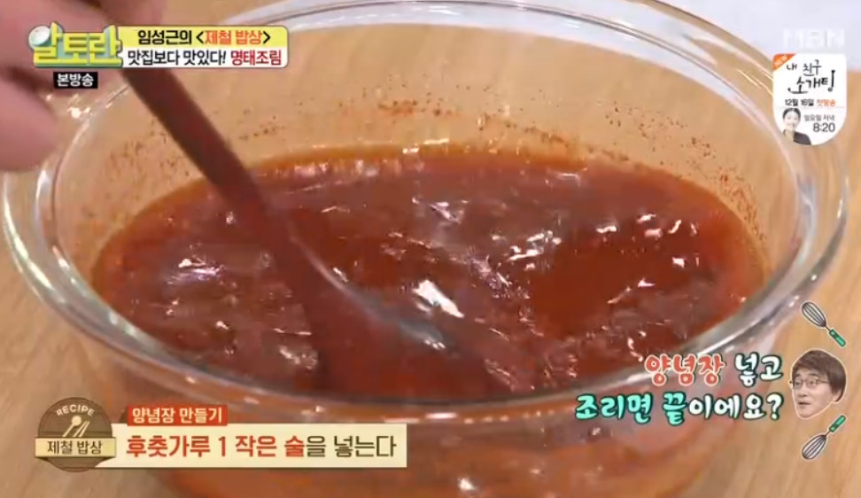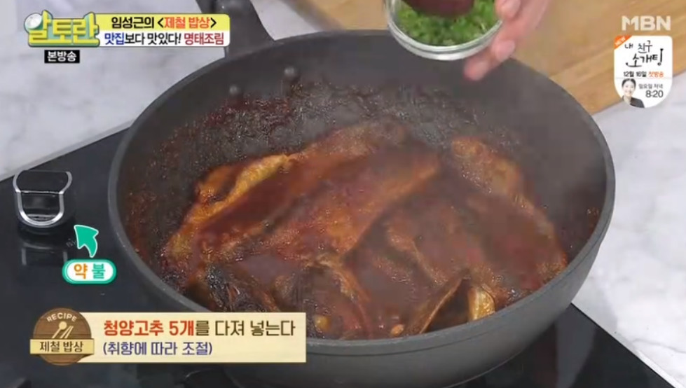 여기서 달인의 비법이 나옵니다. 바로 명태조림 양념장을 명태 머리와 함께 한 번 끓여주는 거예요. 이렇게 하면 맛의 풍미가 훨씬 깊어진다고 해요. 끓여서 사용하는 것과 끓이지 않고 사용하는 것은 큰 차이가 있으니 꼭 양념장을 한 번 끓여주세요.