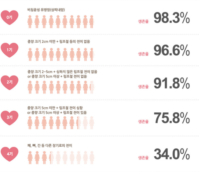 유방암은 여성의 암 발병률 1위를 차지하는 질환이지만 조기에 발견하면 생존율이 97%가량으로 아주 높은 편에 속합니다. 하지만 무증상이 많아서 조기 발견이 어려운 것이 문제입니다. 유방암의 각 병기별 생존율은 아래와 같습니다.